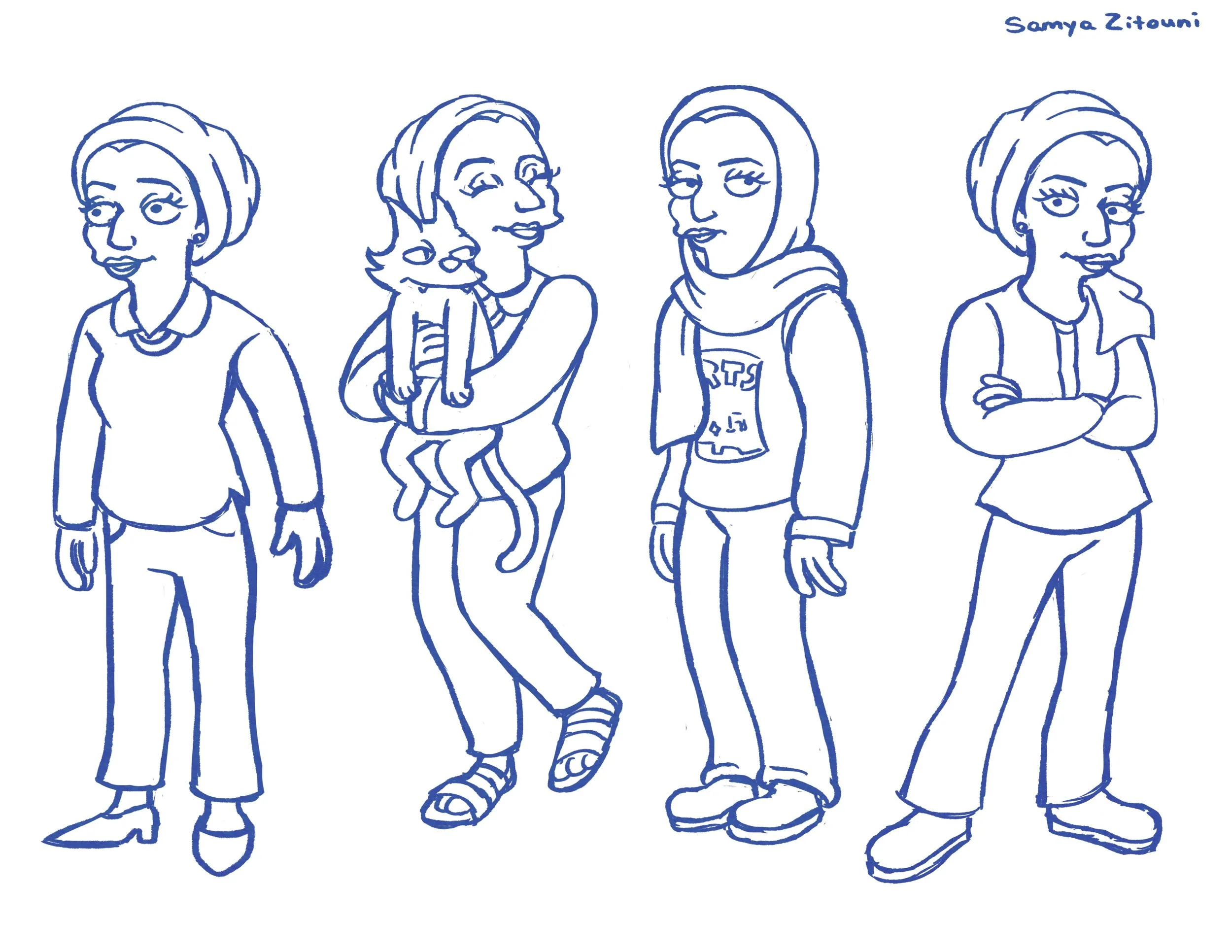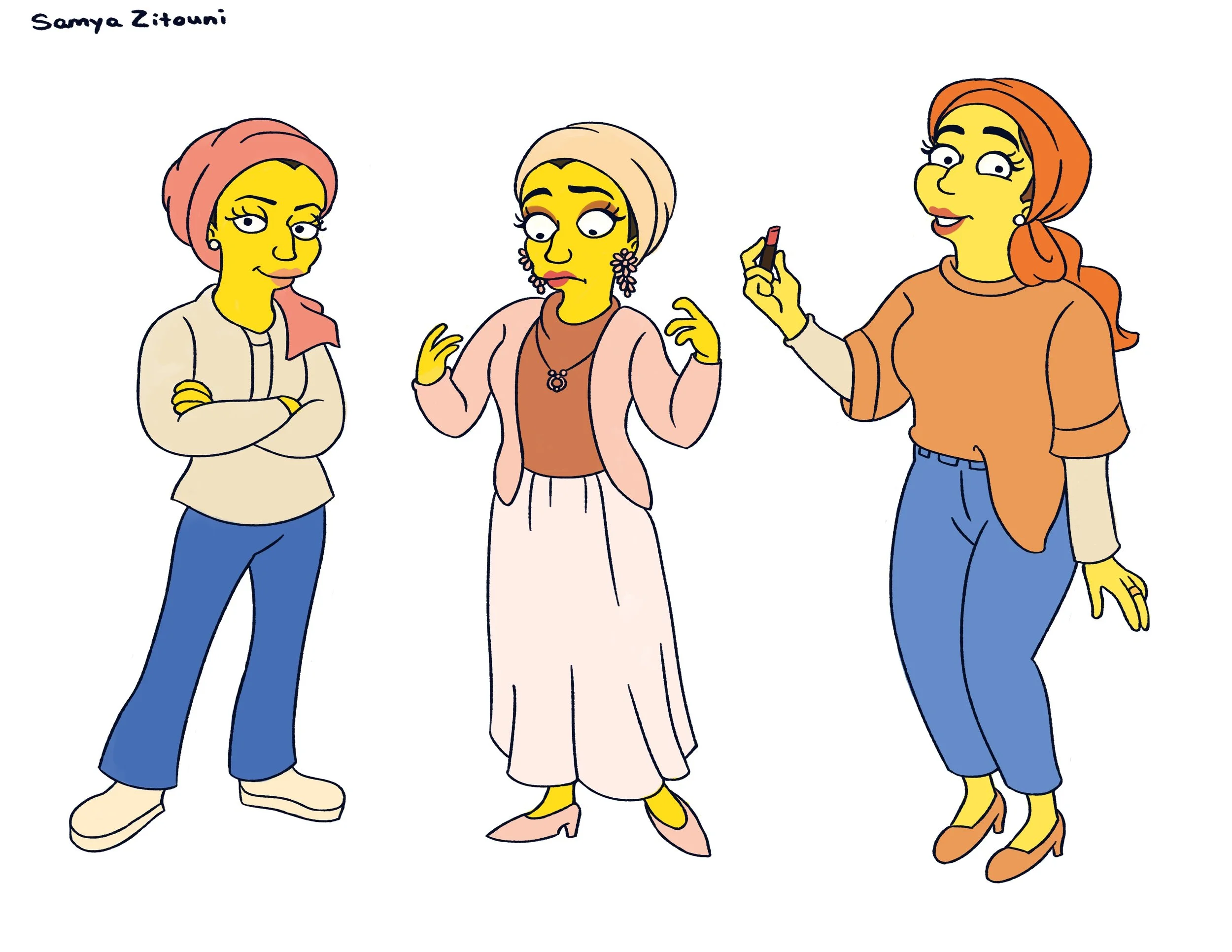 Character Design assignment from college - drawing 2 celebrities in an established style (Youtuber Tazzy Phe depicted in the house style of “The Simpsons”)